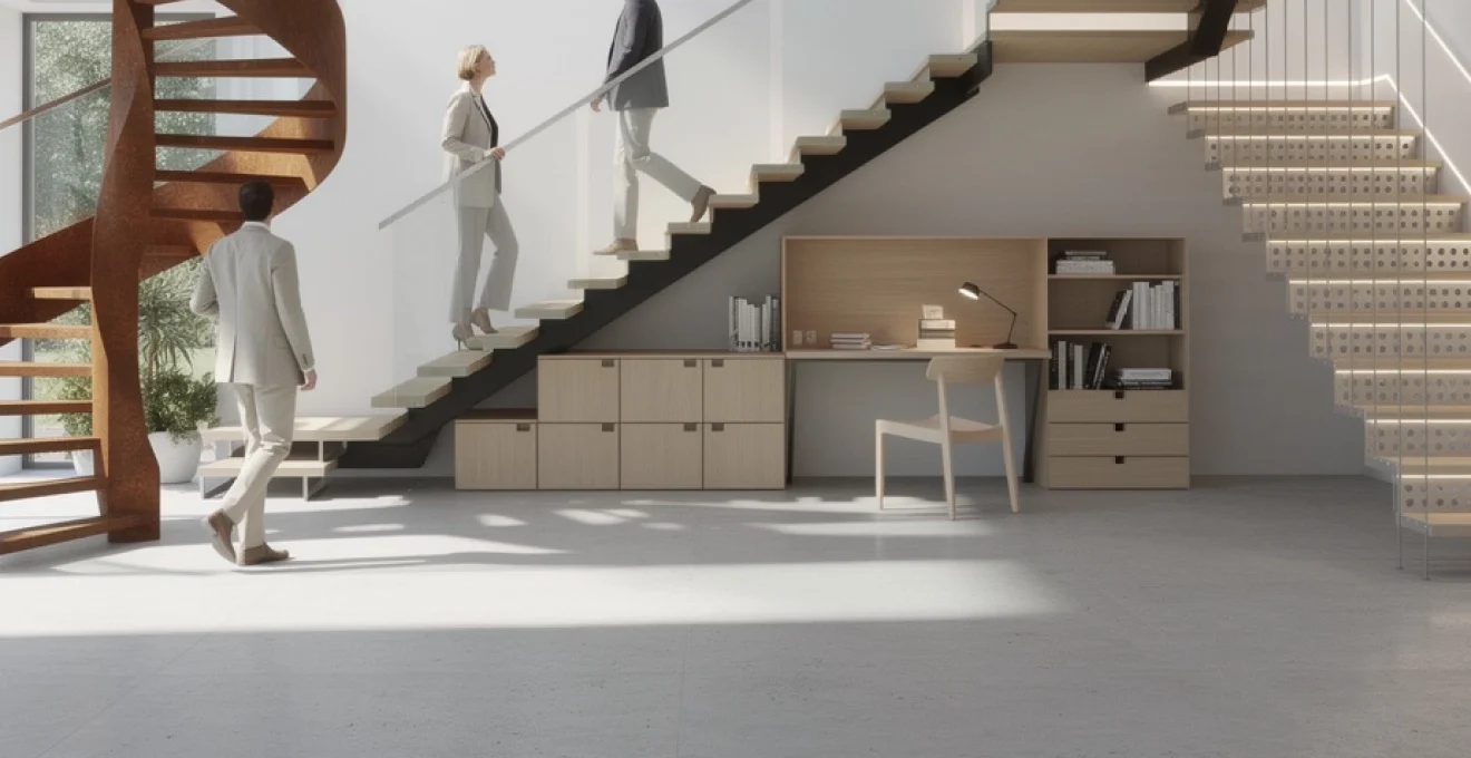 Enfin, dans les petits intérieurs, l’espace sous-escalier peut accueillir un véritable micro-espace de vie : bureau compact, coin lecture avec banquette, voire kitchenette dans un studio en duplex. Pour que cette multi-fonctionnalité ne devienne pas une source de désordre, il est recommandé de prévoir dès la conception des solutions d’organisation intégrées : goulottes pour dissimuler les câbles, tiroirs à fermeture douce, éclairage direct et indirect bien pensé. En traitant cet espace comme un volume à part entière, et non comme un simple « recoin », vous transformez votre escalier en noyau fonctionnel qui structure la maison. Le résultat ? Un effet visuel saisissant, une pièce fluide et des volumes parfaitement optimisés, sans impression de surcharge.