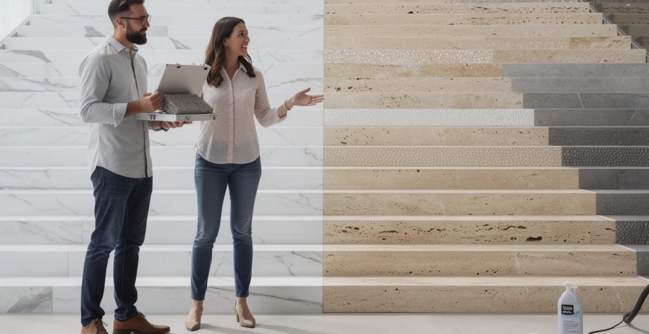 Pour un escalier en travertin, le choix entre finition rebouchée et finition “naturelle” est déterminant. Une finition rebouchée (résine ou mortier teinté) permet d’obtenir une surface plus régulière, plus facile à entretenir et moins sujette à l’encrassement dans les cavités. À l’inverse, une finition non rebouchée accentue le caractère rustique de la pierre mais demande un entretien beaucoup plus rigoureux, notamment pour éviter l’accumulation de poussière et de graisse dans les alvéoles. Dans des contextes de trafic modéré (maison individuelle, duplex), ces pierres calcaires constituent un compromis intéressant entre budget, esthétique et confort d’usage.